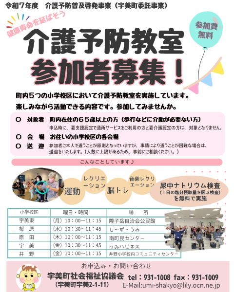 元気な毎日を応援する「介護予防教室」を 毎週1回、開催しています。 たくさんのシニアの方々が参加しています。 「介護予防教室」では、 無理なく続けられる簡単な体操や 日頃の生活に役立つミニ講座、 思わず笑顔になる音楽レクリエーションや、 楽しい頭の体操(脳トレ)など盛り沢山です! 参加してみたいなと思われた方は、 宇美町社会福祉協議会までご連絡下さい♪ ■対 象:町内在住の65歳以上の方(歩行などに介助が必要ない方) ■参加費:無料 ■会 場:お住まいの小学校区の各会場