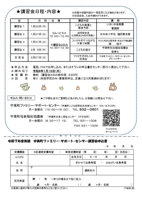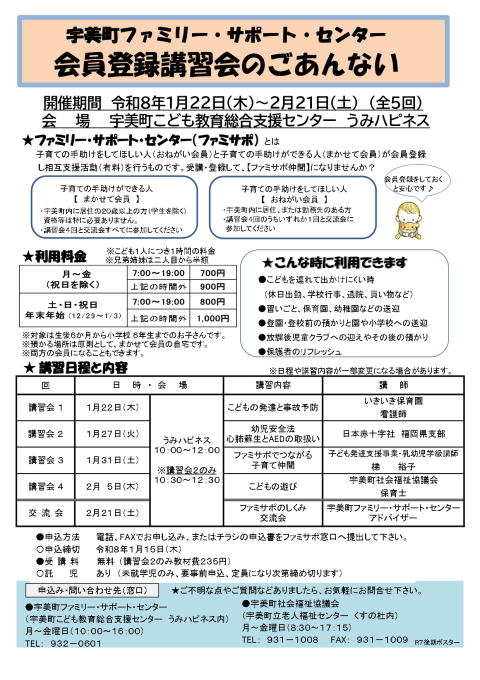 | ファミサポ講習会を受講して、あなたも「ファミサポ仲間」になりませんか? ◇開催日:令和8年1月22日(木)〜2月21日(土) 全5回 ◇会 場:宇美町こども教育総合支援センター うみハピネス |